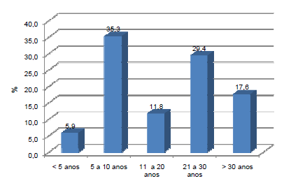 Com menos de 5 anos registamos o valor mais baixo de 5,9%, em seguida, de 11 a 20 anos correspondem a 11,8%, mais de 30 anos 17,6%, 29,4% entre os 21 e os 30 anos e o número máximo de percentagem 35,3 % encontram se de 5 a 10 anos.