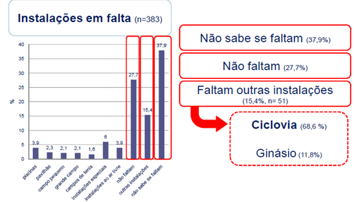 De acordo ainda com a amostra 37,9% não sabem se faltam instalações, enquanto 27,7% acham que não faltam e 15,4% acreditam que faltam, desta percentagem que são 51 inquiridos, 68,6% acham que falta uma ciclovia e 11,8% um ginásio.